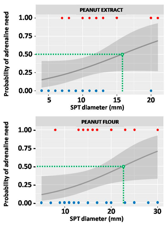 The probability of severe anaphylaxis which would require adrenaline use in relation to the result of skin prick test (SPT) with peanut extract (upper graph) and peanut flour (lower graph). Red dots represent SPT results of individuals who required adrenaline, and blue dots those who did not. Green dashed lines indicate the SPT thresholds (expressed in millimeters), which correspond to 50% probability of adrenaline use. The grey line represents probability curve, whereas grey shading corresponds to the 95% confidence intervals.