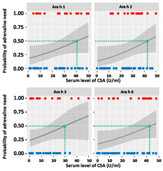 The probability of severe anaphylaxis which would require adrenaline use in relation to the serum level of respective component-specific antibodies (CSAs). Red dots represent CSA levels of individuals who required adrenaline, and blue dots those who did not. Green dashed lines indicate the CSA thresholds (expressed in U/mL), which correspond to 50% probability of adrenaline use. The grey line represents probability curve, whereas grey shading corresponds to the 95% confidence intervals.