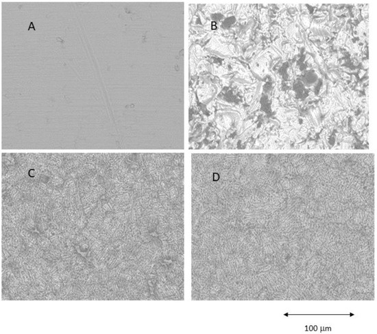 The SEM (Jeol 6400, Jeol, Tokyo, Japan) was used to observe the topography, and the evaluation of surface roughness was performed by means of Confocal Laser Scanning Microscopy, obtaining the different profiles of the different surfaces (CLSM; OLS Olympus Lext 3000, Shinjuku, Japan). First, the equipment was verified with the use of a reference sample (Mitutoyo SR 15, Elgoibar, Spain “Precision Reference Specimen”: Sa = 0.10 μm). A total of 3 measurements in 3 samples of each surface were calculated [60]. The surfaces observed by Scanning Electron Microscopy are shown in Figure 1.