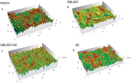 The microhardness results indicate values for MACH surfaces of 178 HVN (sd 23), for AE surfaces of 188 HVN (sd 17), for abrasive spray-treated GTBLAST of 265 (sd 23), and for GBLAST + AE of 268 (sd 23). These results indicate significant differences between the MACH and AE surfaces with respect to the GBLAST and GBLAST + AE. This can be explained by the co-pressure exerted on the projection of the abrasive particles. Between MACH and AE, as well as between GBLAST and GBLAST + AE, the differences were not statistically significant (p < 0.001).