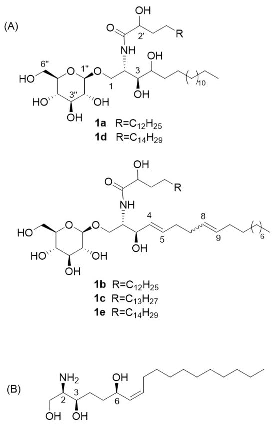 - Santalova, E.A.; Denisenko, V.A.; Dmitrenok, P.S. Structural analysis of oxidized Cerebrosides from the extract of deep-sea sponge Aulosaccus sp.: Occurrence of amide-linked allylically oxygenated fatty acids. Molecules 2020, 25, 6047. [Google Scholar] [CrossRef] [PubMed]