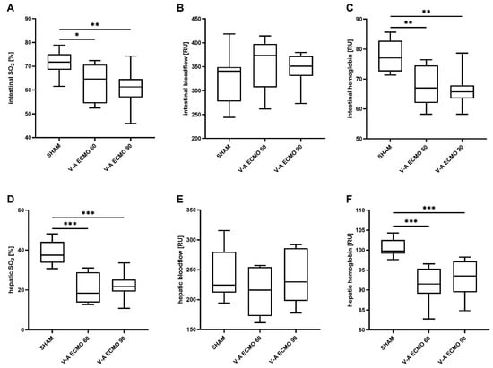 Intestinal tissue oxygenation saturation (SO2) and relative hemoglobin concentrations measured by white light and laser Doppler spectrometry were lower during V-A ECMO therapy with low (60 mL/kg/min; V-A ECMO 60) and high (90 mL/kg/min; VA-ECMO 90) blood flow than during a sham procedure (SO2: sham vs. V-A ECMO 60, p = 0.042; sham vs. V-A ECMO 90, p = 0.006; relative hemoglobin: sham vs. V-A ECMO 60, p = 0.003; sham vs. V-A ECMO 90, p = 0.001; Figure 1A,C). Additionally, hepatic SO2 and relative hemoglobin concentrations were lower during high- and low-flow V-A ECMO therapy than sham therapy (all p < 0.001; Figure 1D,F). However, intestinal and hepatic blood flow did not differ significantly between high- and low-flow V-A ECMO therapy and sham animals (intestine: sham vs. V-A ECMO 60, p = 0.306; sham vs. V-A ECMO 90, p = 0.706; liver: sham vs. V-A ECMO 60, p = 0.388; sham vs. V-A ECMO 90, p = 1.000; Figure 1B,E).