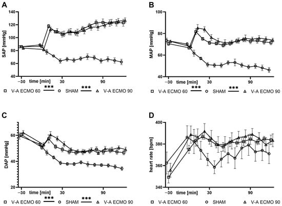 Time course of (A) SAP, (B) MAP, (C) DAP, and (D) heart rate. SAP, DAP, and MAP were measured elevated during low- and high-flow V-A ECMO therapy and septic shock than during sham procedure. Heart rate did not differ significantly between low- and high-flow V-A ECMO therapy and sham therapy. The asterisks denote the degree of statistical significance: ***, p < 0.001. Abbreviations: DAP = diastolic arterial pressure; ECMO = extracorporeal membrane oxygenation; MAP = mean arterial pressure; SAP = systolic arterial pressure; V-A = veno-arterial.