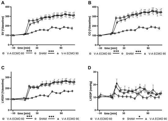 Time course of (A) SV, (B) CO, (C) LVEDV, and (D) LVEDP. While SV, CO, and LVEDV were significantly higher with low- and high-flow V-A ECMO therapy than sham procedure, LVEDP was only significantly higher with high-flow V-A ECMO therapy than sham procedure. The asterisks denote the degree of statistical significance: *, p < 0.05; ***, p < 0.001. Abbreviations: CO = cardiac output; ECMO = extracorporeal membrane oxygenation; LVEDP = left ventricular end-diastolic pressure; LVEDV = left ventricular end-diastolic volume; SV = stroke volume.