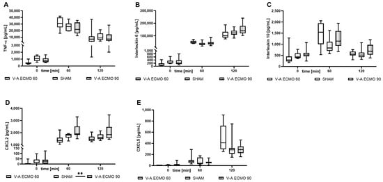 Time course of the plasma concentrations of the inflammatory parameters (A) TNF-α, (B) IL-6, (C) IL-10, (D) CXCL2, and (E) CXCL5. While CXCL2 concentrations were significantly higher with high-flow V-A ECMO therapy than sham procedure, TNF-α, IL-6, IL-10, and CXCL5 concentrations did not differ significantly between low- and high-flow V-A ECMO therapy and sham animals. The asterisks denote the degree of statistical significance: **, p < 0.010. Box and whisker plots indicate the median, interquartile range (box), and minimum and maximum (whiskers). Abbreviations: CXCL2 = C-X-C motif ligand 2; CXCL5 = C-X-C motif ligand 5; TNF-α = tumor necrosis factor alpha.