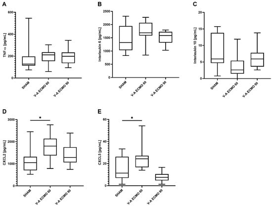 The concentrations of the inflammatory (A) TNF-α, (B) IL-6, (C) IL-10, (D) CXCL2, and (E) CXCL5 in the BAL. While CXCL2 and CXCL5 concentrations were significantly higher during low-flow V-A ECMO than sham therapy, TNF-α, IL-6, and IL-10 concentrations did not differ significantly between low- and high-flow V-A ECMO therapy and sham procedure. The asterisks denote the degree of statistical significance: *, p < 0.05. Box and whisker plots indicate the median, interquartile range (box), and minimum and maximum (whiskers). Abbreviations: CXCL2 = C-X-C motif ligand 2; CXCL5 = C-X-C motif ligand 5; TNF-α = tumor necrosis factor alpha.