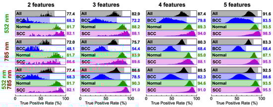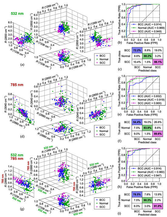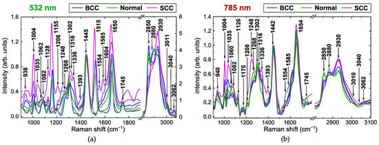 | 532 nm | 785 nm | 532 nm | 785 nm | All | BCC | Normal | SCC |