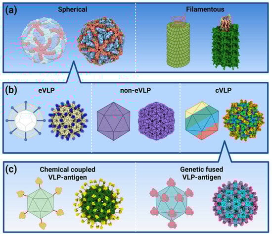 As mentioned above, VLPs are viral capsids without genetic material, preventing their replication and, therefore, infection capacity. These structures are formed by viral capsid proteins or other self-assembly proteins [,,]. VLPs can be both spherical and filamentous structures. Based on the structure of the coated protein, both types of VLPs can be classified as enveloped (eVLP), non-enveloped or naked (non-eVLP), and chimeric (cVLP) [] (Figure 2).
