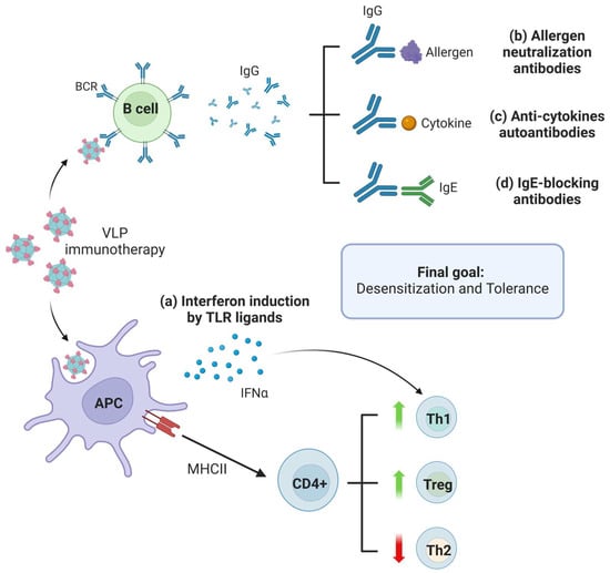 Proposed immune mechanisms associated with the main strategies of VLP immunotherapies against allergies. The strategies share two common mechanisms: The first is based on the recognition of the formula by the BCR of B cells and consequent antibody production. The second consists of the detection of VLPs by APCs and the following presentation to CD4+ lymphocytes, enhancing Th1 and Treg responses with a decrease in the Th2 pathway. Depending on the approach, specific mechanisms will occur: (a) TLR ligands coupled to VLP platforms will induce the secretion of class I interferons, skewing the response to a Th1-type. (b) Allergen-conjugated VLPs can trigger the production of neutralizing antibodies against the allergen itself. (c) Cytokines bound to VLPs can lead to the secretion of anti-cytokines autoantibodies. (d) VLPs combined with IgEs elicit the synthesis of anti-IgE antibodies to inhibit the function of the main allergy immunoglobulin. The main goal of these immunotherapies is the desensitization of the patient to the specific allergen and the induction of tolerance (created with BioRender.com).