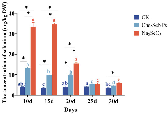 The effects of exogenous treatment with sodium selenite (Na2SeO3) and chemical nano-Se (Che-SeNPs) on the Se concentrations of C. paliurus. Note: using the Duncan test (p < 0.05), the letters of the same color indicate the degree of significant difference between the same Se source at different sampling time periods; * indicates a significant difference between different Se sources at the same sampling time period. The bars indicate the standard deviation for the three replicates. CK = control.