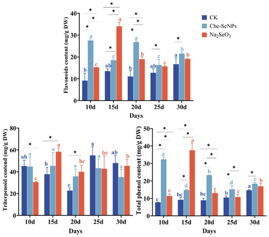 The effects of exogenous treatment with Na2SeO3 and Che-SeNPs on the concentrations of secondary metabolites in C. paliurus. Note: using the Duncan test (p < 0.05), the letters of the same color indicate the degree of significant difference between the same Se source at different sampling time periods; * indicates a significant difference between different Se sources at the same sampling time period. The bars indicate the standard deviation for the three replicates. DW = dry weight; CK = control.