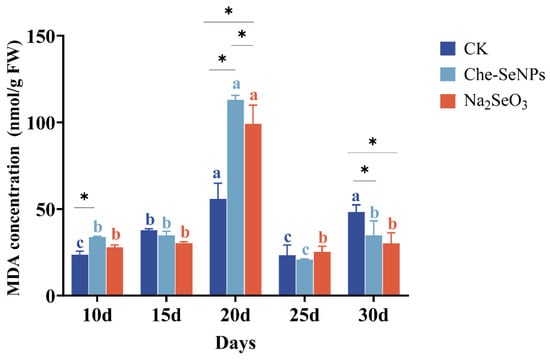 The effects of exogenous treatment with Na2SeO3 and Che-SeNPs on the malondialdehye (MDA) contents of C. paliurus. Note: using the Duncan test (p < 0.05), the letters of the same color indicate the degree of significant difference between the same Se source at different sampling time periods; * indicates a significant difference between different Se sources at the same sampling time period. The bars indicate the standard deviation for the three replicates. FW = fresh weight; CK = control.