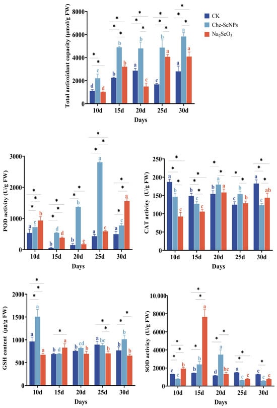 The effects of exogenous treatment with Na2SeO3 and Che-SeNPs on the antioxidant enzyme activity in leaves of C. paliurus. CAT = catalase; GSH = glutathione; POD = peroxidase; SOD = superoxide dismutase. Note: using the Duncan test (p < 0.05), the letters of the same color indicate the degree of significant difference between the same Se source at different sampling time periods; * indicates a significant difference between different Se sources at the same sampling time period. The bars indicate the standard deviation for the three replicates. FW = fresh weight; CK = control.