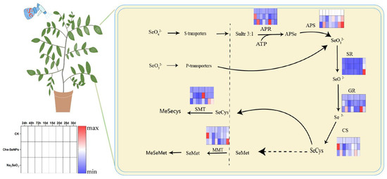 The effect of the foliar application of different forms of Se on the organic Se content of plants is mainly reflected in the absorption, transformation, and accumulation of Se. Selenate is more easily absorbed than selenite, while elemental Se is not easily absorbed by plants. This is mainly due to the similarity between selenate, selenite, and sulfate or sulfite, which leads to competition for absorption between Se and sulfur. Therefore, although the Se content in the Se treatment groups was much higher than that in the control group, the Se content in the Che-SeNP treatment group was much lower than that in the Na2SeO3 treatment group, which fully confirmed that Na2SeO3 is better absorbed and utilized by plant leaves than nano-Se. The content of SeCys2 was higher in the control and Che-SeNP groups, which had lower total Se contents, indicating that SeCys2 is a common form of Se in the leaves of C. paliurus. When the Se content increased to a certain level, SeCys2 transformed into other forms of Se. At the start of Se application, the content of MeSeCys in C. paliurus rapidly increased, indicating that C. paliurus, like most plants, uses MeSeCys to reduce the potential toxicity of Se. The key enzyme gene SMT involved in this reaction indeed showed higher expression in the Na2SeO3 treatment group. MeSeCys can be further transformed into volatile dimethyldiselenide (DMDSe), which is an important reason why plants can tolerate high levels of Se. The APR and APS genes are key enzyme genes involved in the process of converting SeO42− to SeO32−. The active expression of these two genes at certain times indicated that when Na2SeO3 is sprayed on the leaves, some SeO32− is oxidized to SeO42− and then absorbed by the leaves. SR is an enzyme gene involved in the process of converting SeO32− to SeO2−. Except at the 30-day time point, its gene expression remained stable at a relatively low level, indicating that in the case of C. paliurus, this process is likely to involve non-enzymatic reactions.