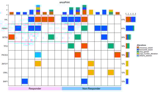 In this patient cohort, oncoprint analyses were created by focusing on variants that were presumed to be oncogenic drivers in OncoKB among the genes that were found to be mutated in this study (Figure 1). The most frequently mutated genes were VHL (47%), PBRM1 (41%), and SETD2 (24%). In terms of the percentage of these gene mutations, they are slightly more common in SETD2, but the rest are comparable to those reported in the past [,,,]. There were no significant differences in the expression frequencies of these genes between responders and non-responders (Table 3).