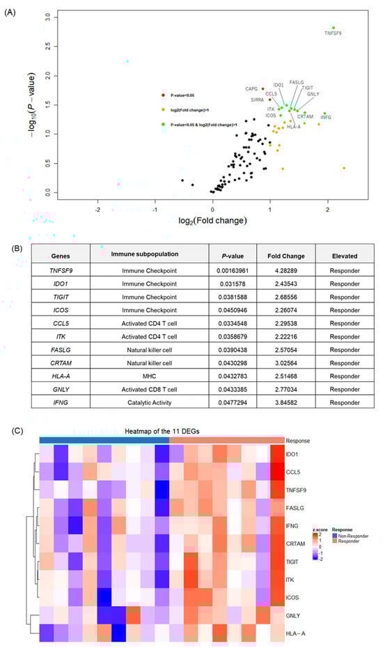 The differentially expressed genes (DEGs) in primary tumors between responders and non-responders. (A) A volcano plot showing the distribution of the DEGs between responders and non-responders. (B) A list of the significant DEGs between responders and non-responders. (C) A heatmap of the 11 significant DEGs. Shades of blue and red correlate with increasing or decreasing Z scores (from −2 to 2), with white representing a Z score of 0.