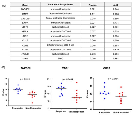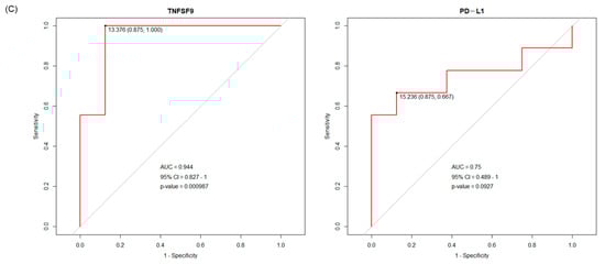 Also, when ROC analysis is performed for each gene, there are 12 genes with p-values of less than 0.05. Of these, three have an area under the curve (AUC) greater than 0.8: TNFSF9, TAP1, and CD8A (Figure 3A). Interestingly, significant differences in each gene show the smallest p-value for TSFNF9 (p = 0.0010) (Figure 3B). The AUC is also the largest for TNFSF9 (AUC = 0.9444), whereas that of PD-L1 is lower (AUC = 0.75) (Figure 3A,C). These results suggest that TSFNF9 is a potential predictive biomarker for immunotherapy in patients with mRCC.