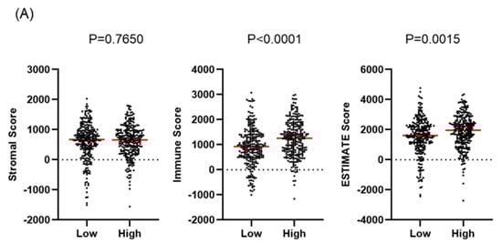 The levels of infiltrating stromal and immune cells were estimated for each sample based on the gene expression profiles, utilizing the “Estimation of STromal and Immune cells in MAlignant Tumours using Expression data” (ESTIMATE) algorithm (https://bioinformatics.mdanderson.org/publicsoftware/estimate/ (accessed on 28 March 2022)) [].