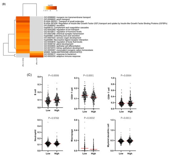 The analysis of DEGs using Metascape revealed that gene pathways related to adaptive immune responses, response to bacteria, and NABA MATRISOME (a collection of extracellular matrix-associated proteins and related factors) [] were upregulated in TNFSF9-high-expression tumors (Figure 4B). In addition, we analyzed the population of immune cells infiltrating tumor cells using TIMER, finding that B cells, CD8+ T cells, and myeloid dendritic cells were significantly increased in the high-TNFSF9-expression group (Figure 4C). These findings suggest that tumors with high TNFSF9 expression have more antigen-presenting cells and occur at a certain level of acquired immune responses. It is also possible that in the TNFSF9-high-expression group, the immune response is better regulated by the inter-relationship between the extracellular matrix and immune cells [].