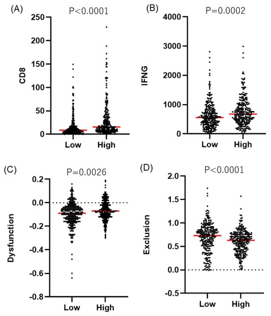 An analysis of T cells via TIDE also showed significantly more CD8+ T cells and significantly higher levels of interferon-gamma in the TNFSF9-high tumors (Figure 5A,B). In addition, there were significantly fewer exclusionary T cells and more dysfunctional T cells in the TNFSF9-high tumors (Figure 5C,D), suggesting that T cell function may be more impaired in the tumors. However, the association between TNFSF9 and CD274 expression was not significant (Figure 5E).