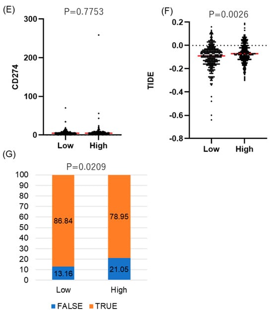 The TIDE score is calculated using two mechanisms of immune evasion: the induction of T cell dysfunction in tumors with high infiltration of cytotoxic T cells and the inhibition of T cell infiltration in tumors with few cytotoxic T cells []. In general, patients with high TIDE scores are less likely to respond to immune checkpoint inhibitor (ICI) monotherapy (CTLA4 inhibitors or PD-1 inhibitors), and the predominance of high TIDE scores in the TNFSF9-high tumor suggests that ICI monotherapy may be less effective (Figure 5F,G).
