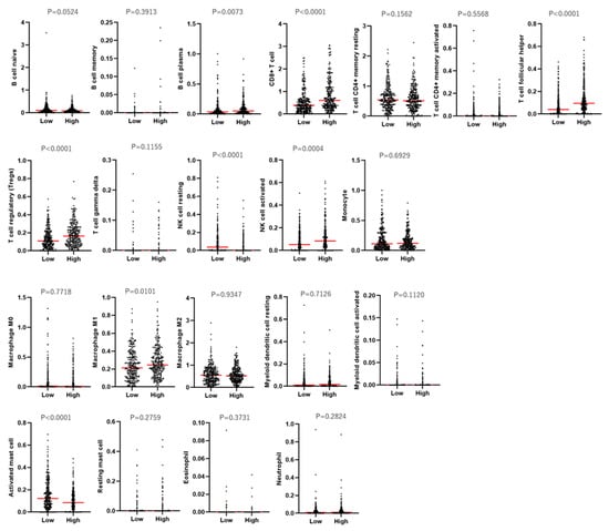The Tumor IMmune Estimation Resource 2.0 (TIMER2.0) (http://cistrome.org/TIMER/ (accessed on 28 March 2022)) [] was used to estimate the population of tumor-infiltrating immune cells.