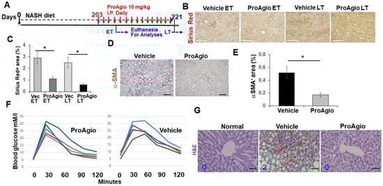 We previously reported the development of a protein (ProAgio) that targets integrin αvβ3 at a non-ligand binding site. ProAgio induces the apoptosis of integrin αvβ3, expressing cells by recruiting/activating caspase 8 to the cytoplasmic domain of the targeted integrin []. ProAgio reversed liver fibrosis/cirrhosis in TAA/alcohol-induced and CCl4-induced liver fibrosis murine models. Our study revealed that ProAgio simultaneously depleted αHSCs, resulting in a reduction in the expression of collagen fibrils, and reversed sinusoid remodeling, resulting in relieving blood flow resistance in the fibrotic liver of the mice in the murine models []. NASH represents a great health care challenge, as no effective strategies or agents are available for the treatment of NASH. Evidence suggests that both αHSCs and caLSECs play critical role in NASH development and progression [,]. We sought to identify whether ProAgio would be effective in NASH treatment due to its unique drug activity. We employed the common NASH diet-induced NASH mouse model [,]. Nine-week-old C57BL/6 mice were fed a high-fat (HD) NASH diet and d-glucose in drinking water. After 29 weeks of NASH diet feeding, the animals were treated via ProAgio 10 mg/kg or a vehicle daily, with i.p. dosing, for either 4 days (early treatment, ET) or 2 weeks (late treatment, LT). The animals were euthanized 3 days after the last dose of the ET or LT treatment (Figure 1A). The mice were continuously on a NASH diet during the ProAgio or vehicle treatment. Sirius Red staining of liver sections demonstrated less and thinner collagen accumulation in the livers of the ProAgio-treated animals compared to the vehicle-treated animals (Figure 1B,C). IHC staining of αSMA in liver sections showed reduced αSMA-positive αHSCs in NASH liver (Figure 1D,E). The primary driver of NAFLD/NASH is over-nutrition. Therefore NAFLD/NASH is associated with an alteration in blood glucose levels [,]. We sought to identify whether ProAgio treatment would improve blood glucose in the NASH mice. The C57BL/6 mice were fed a high-fat NASH diet for 22 weeks. The mice were treated with ProAgio 10 mg/kg i.p. daily dose for 10 days or a vehicle treatment. Two weeks after the treatment, a glucose tolerance test was performed on the treated animals. Apparently, ProAgio lowered the fasting blood glucose and improved the glucose tolerance of the NASH mice (Figure 1F). H&E staining of the liver sections indicated the clearance of fat accumulation in the liver (Figure 1G). Our results suggest that ProAgio is effective in the HD-NASH diet-induced murine NASH model.