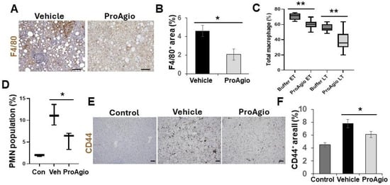 One typical feature of NASH progression is hepatocyte ballooning due to inflammation-induced hepatocyte injury [,]. Close examination of the H&E staining results revealed that ProAgio treatment clearly reduced hepatocyte ballooning (the vehicle-treated mice score went from scoring 2 to scoring 0, similar to that of normal mice) (Figure 1G), suggesting that the treatment might decrease inflammation in NASH liver. To verify the effects of ProAgio on NASH liver inflammation, IHC F4/80 staining in the liver sections showed reduced macrophages in NASH liver (Figure 2A,B). Furthermore, FACS analysis of innate immune cells also verified the effects of ProAgio on the infiltration/activation of macrophages and polymorphonuclear neutrophils (PMNs) in NASH liver (Figure 2C,D). It has recently been demonstrated that CD44 is a key player of hepatic inflammation during NASH and liver fibrosis progression [,]. We therefore explored the effects of ProAgio on CD44 in NASH liver. IHC staining of CD44 with the liver sections showed that ProAgio decreased the CD44 levels by 1.5-fold compared to the vehicle-treated group (Figure 2E,F). Our experiments clearly suggest that ProAgio strongly reduced hepatic inflammation associated with NASH progression, providing an important treatment advantage.