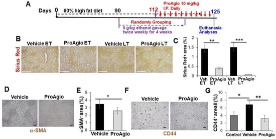 ProAgio decreases hepatic fibrosis in AH mice. (A) The scheme illustrates the ProAgio or vehicle treatment regimen for the AH mice. (B,C) Representative images (B) and quantifications (C) of Sirius Red staining of liver sections from mice treated with indicated agents. (D,E) Representative images (D) and quantifications (E) of IHC staining of αSMA in liver sections from the treated mice. (F,G) Representative images (F) and quantifications (G) of IHC staining of CD44 in liver sections from mice treated with indicated agents. The quantities in (C,E,G) are presented as % of staining positive area. Three randomly selected view fields per section, four randomly selected sections per animal, and six randomly selected animals (n = 6) were quantified. Veh in (G) is the vehicle-treated group. Control in (G) means the mice were normal healthy mice without disease induction and subsequent treatments. The error bars in (C,E,G) are standard deviations of 6 independent mice. Statistical analysis of data was performed by a Student’s t-test for a two-group comparison or a one-way ANOVA with Tukey’s multiple comparison test. (* p < 0.05, ** p < 0.01, and *** p < 0.001).