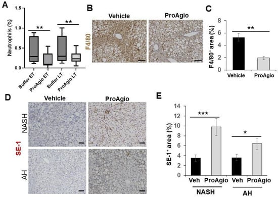 ProAgio reduces inflammation in AH mouse liver. (A) The total population of neutrophils (Neutrophil%) in the liver tissues from the AH mice that were treated with indicated agents was analyzed by FACS (CD11b+ Ly-6G+). (B,C) Representative images (B) and quantifications (C) of F4/80 staining of liver sections from mice treated with indicated agents. The quantity of total macrophage levels is presented as % of staining positive area. (D,E) Representative images (D) and quantifications (E) of IHC staining of SE-1 in liver sections from the NASH and AH mice that were treated with indicated agents. The quantity of differentiated healthy LSEC levels in (E) is presented as % of SE-1-positive staining area. The error bars in (A,C,E) are standard deviations of measurements of 6 mice. Statistical analysis of data was performed by a one-way ANOVA with Tukey’s multiple comparison test or an unpaired Student’s t-test for two-group comparisons. (* p < 0.05, ** p < 0.01, and *** p < 0.001).