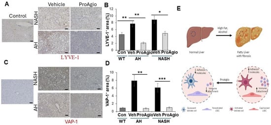 The question of how ProAgio decreases leukocyte infiltration in both NASH and AH liver is an open question. Intact liver sinusoids are the protective gate that prevents passenger leukocytes from entering into the space of Disse due to a lack of expression of leukocyte adhesion molecules on healthy LSECs [,,,,]. LSEC capillarization converts the immune-protective sinusoids into inflammation-stimulative sinusoids due to the high levels of the leukocyte adhesion molecules expressed on caLSECs, allowing for leukocyte trans-endothelial migration [,,]. We previously reported that ProAgio reversed sinusoid remodeling, resulting in the relief of blood flow resistance in fibrotic liver of mice in TAA/alcohol- and CCl4-induced liver fibrosis murine models []. Thus, we sought to examine whether ProAgio also reversed sinusoid remodeling and LSEC capillarization in the NASH and AH livers. We analyzed the effects of ProAgio on sinusoids in NASH and AH liver. Similar to our previous study, IHC staining of SE-1 revealed that ProAgio treatment increased SE-1 staining (Figure 4D,E), thus decreasing caLSEC expression. These analyses suggested that ProAgio reversed sinusoidal remodeling and LSEC capillarization. Next, we analyzed leukocyte adhesion molecule expression in the NASH and AH liver upon ProAgio treatment. IHC staining of VAP-1 and LYVE-1 [,] in the sections from both the NASH and AH livers demonstrated that the levels of LYVE-1 and VAP-1 were increased due to the induction of NASH and AH. ProAgio treatment dramatically decreased LYVE-1 and VAP-1 in the NASH and AH liver to levels similar to those in normal healthy liver (Figure 5A–D). Our results suggest that ProAgio reversed LSEC capillarization and sinusoidal remodeling in NASH and AH livers. The reversal of sinusoidal remodeling decreased the expression of leukocyte adhesion molecules on the LSECs, thus preventing leukocyte infiltration and decreasing hepatic inflammation.