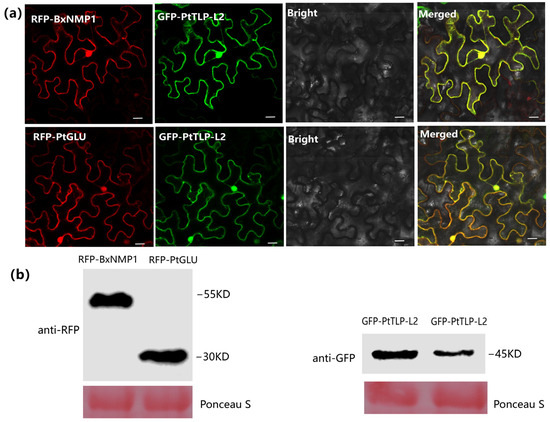 2.6. BxNMP1, PtTLP-L2, and PtGLU Colocalize in the Nucleus and Cytoplasm in N. benthamiana