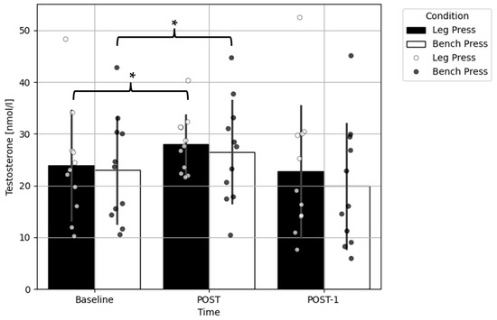 Comparison of the testosterone concentration before and after the bench press and leg press exercise protocols. Data presented as the mean ± standard deviation; * a significant difference compared to the baseline within the condition (p < 0.05); POST—immediately after completion of the exercises; POST-1—an hour after completion of the exercises.