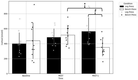 Comparison of the cortisol concentration before and after the bench press and leg press exercise protocols. Data presented as mean ± standard deviation; * a significant difference compared to the POST within condition (p < 0.01); # a significant difference compared to leg press within time point (p < 0.05); POST—immediately after completion of the exercises; POST-1—an hour after completion of the exercises.