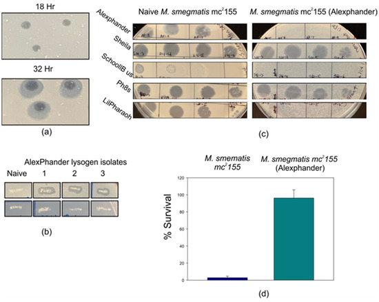 We measured the efficiency of Alexphander lysogeny by plating naïve M. smegmatis mc2 155 onto uninfected 7H10 agar plates or those seeded with Alexphander. We find that the rate of lysogeny is approximately 3%, which is comparable to, albeit somewhat lower than, that of phage Giles (7%), a temperate mycobacteriophage in cluster Q [12]. We note that several other Cluster F1 phages form stable lysogens [15,21]; however, to our knowledge, lysogeny efficiency for these phages has not been explicitly reported. Despite the relatively low rate at which lysogens are formed, Alexphander lysogens are stable, as we observe no difference in the lysogen survival when plated onto phage-seeded vs. unseeded solid media (Figure 1d).