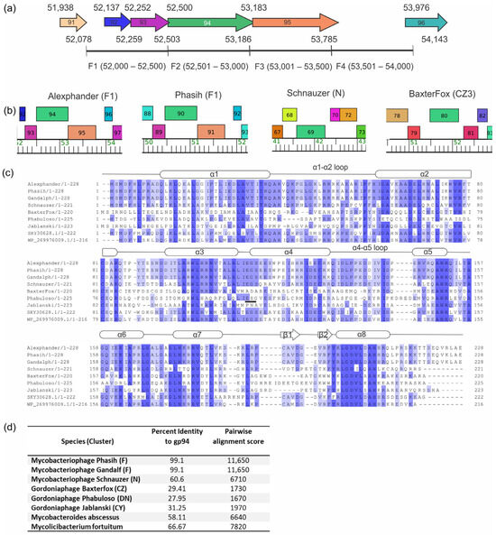 The gene 94 coding sequence is a member of pham 165,933 and overlaps neighboring genes 93 and 95 by four nucleotides (Figure 2a,b and [10]). Pham 165,933 is present in 126 mostly temperate phages (phagesDB.org accessed on 02-07-2024), including 2 different Mycobacteriophage clusters (F and N), 6 Gordoniaphage clusters (CY, CZ, DI, DN, DW, and DY), and 3 singleton phages [22]. In many of these phages, pham 165,933 is more generally annotated to encode helix–turn–helix (HTH) DNA-binding motif-containing proteins. In Alexphander, this pham is annotated to encode a protein containing a MerR-type HTH motif [22]. A PSI-BLAST search shows that gene 94 orthologs are encoded in >113 species within the Actinobacteria and their phages, with an E value < 1 × 10−33. Multiple and pairwise sequence alignments of pham 165,933 and its orthologs identify regions of amino acid conservation and show that cluster F variants are 99% identical but only 60 and 30% identical to cluster N mycobacteriophage and Gordonia phage variants, respectively (Figure 2c,d). There are significant regions of identity over the length of the protein sequence, including in the putative DNA-recognition helix, α7, suggesting that these proteins may have similar DNA sequence preference profiles. Interestingly, synteny of the gene 94 locus is conserved within but varies between clusters F and N phages (Figure 2b). For example, in F1 phages (e.g., Alexphander and Phasih), Alexphander gene 94 (Phasih gene 90) is located within a conserved four-gene locus that includes phams 815 (gene 93/89), 2998 (gene 95/91), and 371 (gene 96/92); however, these genes are absent in pham 165,933 containing phages in clusters N and CZ.