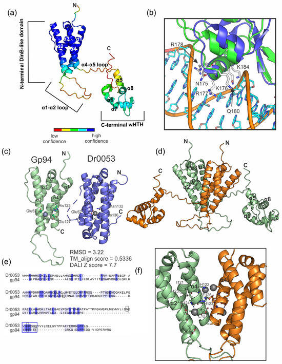 The AlphaFold 2 (AF2) structure prediction algorithm shows that the gp94 N-terminal domain adopts a four α-helix structure that is linked to the C-term wHTH domain by a long, possibly unstructured loop (Figure 4a). The gp94 N-terminal domain is structurally similar to the Dr0053 from Deinococcus radiodurans, a DinB/YfiT family protein, as determined from the DALI structural comparison algorithm [31]. Interestingly, the Dr0053 protein crystallizes with a robust dimerization interface between α1 and α4 of neighboring symmetry mates [32]. This suggests that gp94 may dimerize through its N-terminal domain; however, gp94 is predominantly in the monomeric state during size-exclusion chromatographic analysis (Figure S1d). The Dr0053 crystal structure shows Zn2+ ions bound to the α2—α4 helices and at the dimer interface, which may indicate that gp94 acts as a monomer or that dimerization depends on metal ions, an unknown ligand, or forms heterodimeric complexes containing additional proteins. Zn2+ does not affect gp94–DNA binding, but we have yet to test whether the addition of metal affects the gp94 oligomeric state.