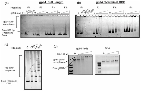 Gp94 binds 500 bp DNA fragments and genomic DNA. (a) Representative electrophoretic mobility shift assay (EMSA) showing gp94 binding to four different 500 bp DNA fragments corresponding to sequences neighboring or within the gene 94 locus (F1–F4). Free F1–F4 and protein-bound species are indicated. Genomic coordinates for fragment sequences are shown in Figure 2. For each fragment, 0, 15.5, 62.5, 250, or 1000 nM full-length gp94 was added to the DNA binding reaction, which was conducted in HEPES-BB + 0.1 M NaCl. (b) Representative EMSA as in “a” but with the C-term gp94 construct containing only C-terminal residues (143–226). Gp94-C-term monomer concentrations are given. Gels in (a,b) are representative of the binding profile observed for numerous experimental trials (>4). (c) EMSA for F1 fragment binding to the E. coli protein, Fis, a known DNA-binding protein that forms discrete protein–DNA complexes of increasing molecular weight by binding to related DNA sites with nM affinity. Fis was added to free DNA at 0 to 312 nM. (d) EMSA in 0.7% agarose gel with Alexphander genomic DNA in the absence and presence of increasing concentrations of gp94. Gp94 concentrations range from 0 to 1000 nM as in “b”. gDNA binding was measured in Acetate-BB and for gp94 (left panel) and BSA alone (right panel).