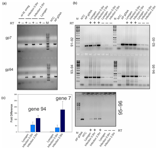 To investigate gene 94 transcription profiles, we performed mRNA expression analysis of gp94 and its neighboring genes to measure relative transcript quantities, identify the timing of transcription, and determine whether these genes are co-transcribed. Total mRNA was isolated from naïve M. smegmatis, Alexphander lysogen, and lytic phage infections at 0.5 and 2.5 h after adsorption. We then generated cDNA by reverse transcription and performed conventional PCR and qPCR analysis. Conventional PCR primers (Table 2) amplify products within genes 7 and 94 and across the boundaries of genes 91–96, and qPCR primers amplify 60 pb segments within genes 7 and 94 (Figure 6a,b). We measured gene 7 expression as a control as it represents a gene known to be maximally expressed late in lytic growth from the late lytic promoter as observed by Ko et al., who used mRNA-seq to measure whole genome expression for the related F1 phage, Fruitloop [44]. PCR and qPCR amplification was dependent on reverse transcriptase and indicates that genes 7 and 94 are transcribed maximally late during lytic growth and that gene 94 is co-transcribed in an operon that includes genes 91–96. This expression profile, while not exhaustive, does correlate well with that of other F1 phages for which mRNA-seq indicates that far-right-end genes are controlled by the late lytic promoter that also drives the expression of structural genes such as the major capsid protein [44]. We note that, in some cases, a very small amount of amplification is observed in the absence of reverse transcriptase, but that amplification is much more robust following reverse transcription. This could be due to low levels of Alexphander gDNA contamination, but it does not detract from the observation that amplification is clearly dependent on reverse transcription.