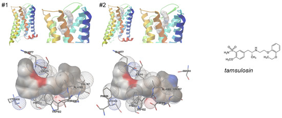 Studies simulating the off-target binding of mirabegron to the α1A-adrenoceptor are not yet available (Figure 1). Here, we report the results from docking simulations using a stabilized cryo-EM structure of α1A, aiming to identify possible receptor positions involved in the binding of mirabegron to α1A.
