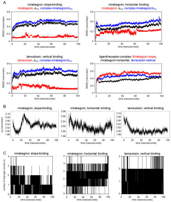 Molecular dynamics in the binding of mirabegron and tamsulosin to the human α1A-adrenoceptor. Shown are root mean square deviation (RMSD) of atomic positions (A), Gyrate charts (B), and numbers of hydrogen bonds (C) during the first 100 nanoseconds following slope and horizontal mirabegron binding and vertical tamsulosin binding to human α1A-adrenoceptor (PDB ID 7YMH). Simulations were performed using GROMACS. RMSD during the binding process was assessed for ligands and the receptor alone and for ligand–receptor complexes, with alterations and fluctuations in RMSD reflecting conformational changes. The radius of gyration (rg) was assessed for the protein backbone, with changes reflecting changes in the compactness of the ligand–receptor complex and, thus, fluctuations in receptor conformation.