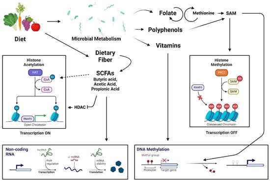 - Krautkramer, K.A.; Kreznar, J.H.; Romano, K.A.; Vivas, E.I.; Barrett-Wilt, G.A.; Rabaglia, M.E.; Keller, M.P.; Attie, A.D.; Rey, F.E.; Denu, J.M. Diet-Microbiota Interactions Mediate Global Epigenetic Programming in Multiple Host Tissues. Mol. Cell 2016, 64, 982–992. [Google Scholar] [CrossRef]
