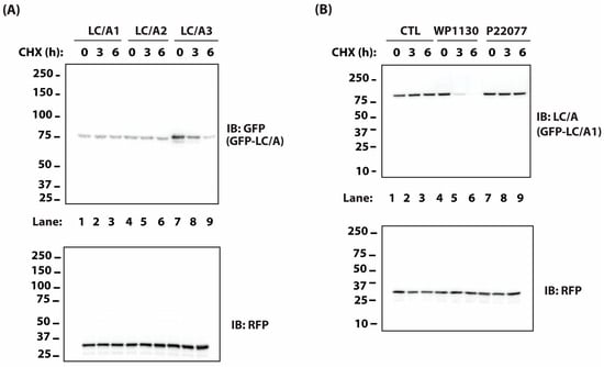 (A) Cells were transfected with plasmids encoding GFP-tagged LC/A1 (Lanes 1–3), LC/A2 (Lanes 4–6), or LC/A3 (Lanes 7–9). After 36 h, cells were treated with 50 μg/mL cycloheximide (CHX) for the indicated times and levels of GFP-LC/As were assessed by immunoblotting (IB) with GFP antibody. (B) Cells transfected with GFP-LC/A1 were treated with CHX and DMSO (Lanes 1–3), 2 μM WP1130 (Lanes 4–6), or 10 μM P22077 (Lanes 7–9). Levels of GFP-LC/A1 were assessed by IB. RFP serves as a transfection efficiency control in (A,B).