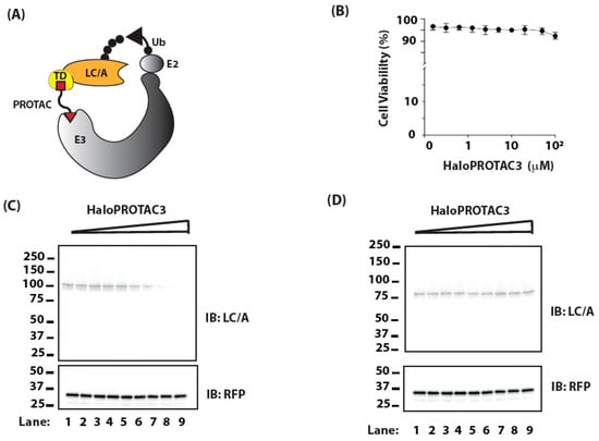 As initial proof of concept, we fused a HaloTag to GFP-LC/A1 (Figure 2A). HaloTag is a haloalkane dehalogenase mutated to covalently bind to a synthetic ligand []. Several HaloPROTACs have been developed that bind the HaloTag and recruit an E3 to increase the ubiquitination of target proteins and thereby enhancing their degradation [,]. We choose HaloPROTAC3 as it can induce complete loss of several proteins fused to HaloTag at 1 μM and is not cytotoxic up to 10 μM [], as measured by mitochondrial function. To further assess the potential toxicity of HaloPROTAC3, we treated HEK-293 cells with different concentrations of HaloPROTAC3 for 24 h and directly assayed cell viability based on cell membrane integrity. Cell viability was minimally affected by treatment with HaloPROTAC3 up to 100 μM (Figure 2B).
