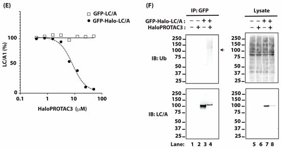 (A) Schematic representation of how a cellular E3 can be redirected to target LC/A using a PROTAC designed to bind a specific targeting domain (TD). The PROTAC binds the TD on one end and recruits the E3 ligase complex that binds to a ubiquitin-conjugating enzyme (E2) charged with ubiquitin (Ub) on the other. (B) Cells were treated with increasing doses of HaloPROTAC3 for 24 h and cell viability was assessed with ethidium homodimer-2. Data shown are mean ± SD (n = 3). (C) Cells transfected with plasmids encoding GFP-Halo-LC/A1 were treated with vehicle (Lane 1) or increasing concentrations of HaloPROTAC3, ranging from ~390 nM (Lane 2) to 50 μM (Lane 9), for 24 h. Levels of GFP-Halo-LC/A1 (arrow) were assessed by IB. (D) Cells transfected with plasmids encoding GFP-LC/A1 lacking the HaloTag were treated with vehicle (Lane 1) or increasing concentrations of HaloPROTAC3, ranging from ~390 nM (Lane 2) to 50 μM (Lane 9), for 24 h. Levels of GFP-LC/A1 were assessed by IB; RFP served as a transfection control in (C,D). (E) Dose responses for GFP-Halo-LC/A1 and GFP-LC/A1 are from data in (C,D). (F) Cells were transfected with plasmids encoding GFP-Halo-LC/A1 and treated for 20 h with 20 μM HaloPROTAC3, followed by 4 h with 30 μM MG132. Cells were lysed in denaturing buffer and processed for immunoprecipitation of GFP-Halo-LC/A1. Ubiquitin and LC/A1 were detected by IB. The arrow indicates the expected apparent molecular weight of unmodified GFP-Halo-LC/A1.