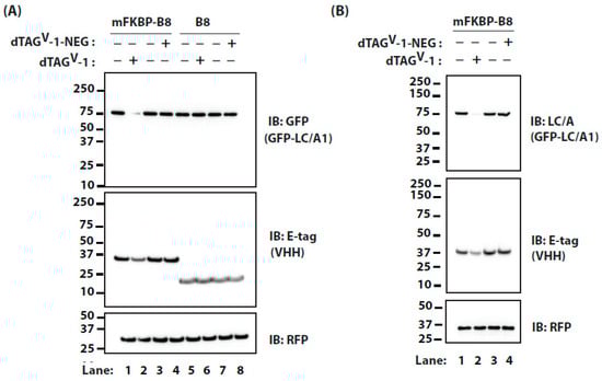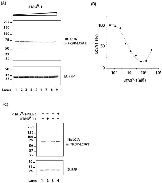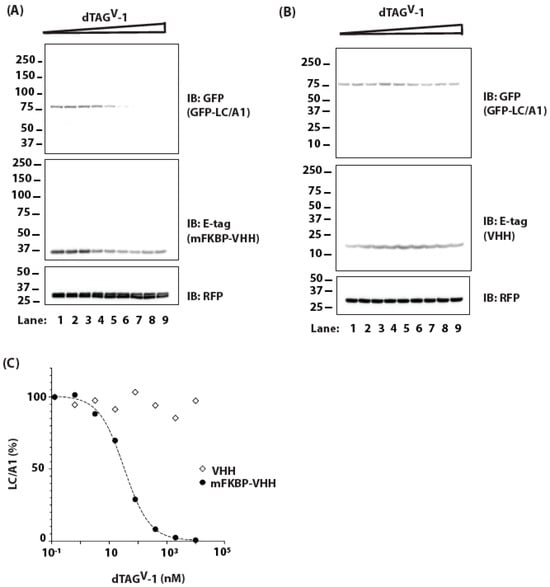 (A) Cells transfected with plasmids encoding mFKBP-tagged VHH and GFP-LC/A1 were treated with increasing concentrations of dTAGV-1, ranging from ~0.1 nM (Lane 1) to 10 μM (Lane 9), for 24 h. Levels of GFP-LC/A1 and mFKBP-tagged VHH were assessed by IB. (B) Cells transfected with plasmids encoding VHH B8 and GFP-LC/A1 were treated with increasing concentrations of dTAGV-1, ranging from ~0.1 nM (Lane 1) to 10 μM (Lane 9), for 24 h. Levels of GFP-LC/A1 and VHH B8 were assessed by IB. RFP serves as a transfection efficiency control in (A,B). (C) Dose response for GFP-LC/A1 in the presence of B8 vs. mFKBP-B8 from (A,B).