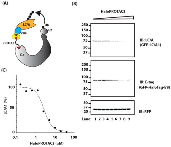 (A) Schematic representation of targeting LC/A with PROTAC using an intermediary protein. Here, an LC/A-specific VHH is fused to the targeting domain (TD) and serves to couple the PROTAC to the LC/A and E3 complex. (B) Cells transfected with plasmids encoding GFP-Halo-VHH and GFP-LC/A1 were treated with increasing concentrations of HaloPROTAC3, ranging from ~156 nM (Lane 1) to 40 μM (Lane 9), for 24 h. Levels of GFP-LC/A1 and GFP-Halo-VHH were assessed by IB. RFP serves as a transfection efficiency control. (C) Dose response for GFP-LC/A1 is derived from data in (B).