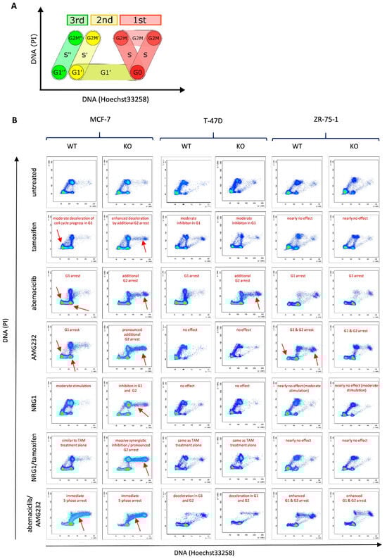 Dynamic proliferation assessment by flow cytometry. (A) The diagram illustrates the course of a non-synchronized cell population and sub-cohorts within three successive cell cycles (red 1st, color 2nd, and green 3rd) monitored within a period of 96 h. (B) Real flow cytometry measurements recorded at 96 h upon continuous treatments. MCF-7, T-47D, and ZR-75-1 WT or KO cells were alternatively treated with tamoxifen, abemaciclib, AMG232, NRG1, NRG1/tamoxifen, or abemaciclib/AMG232. Annotations in red indicate the most pronounced treatment-induced effects. Red arrows point at the most pronounced effects. The complete panels of measurements done after 8, 16, 24, 48, and 72 h, respectively, are shown in Supplementary Figure S2.