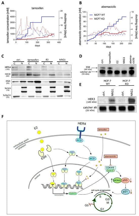 Effects of HER4 knock-out on MCF-7 cells in vitro. (A) Long-term treatment of MCF-7 WT (soild blue line) and MCF-7 KO (soild red line) cells with tamoxifen and corresponding cell doubling times (dashed lines) as a function of concentration. (B) Abemaciclib long-term treatment of MCF-7 WT and KO cells and corresponding cell doubling times (dashed lines) as a function of concentration. (C) Analysis of HER4, 4ICD, and ESR cytoplasmic and nuclear localization by Western blot using fractionated protein lysates (C = cytosol; N = nucleus) of MCF-7 WT cells untreated (ctrl.) and after treatment with tamoxifen (1 µM), E2 (100 nM), or NRG1 (30 ng/mL) for 24 h, respectively. Lamin (nucleus) and tubulin (cytosol) were used as loading controls and indicate the purity of the respective fractions. (D) Immunoprecipitation analysis by Western blotting of untreated (ctrl.) and 24 h tamoxifen (1 µM), E2 (100 nM), NRG1 (30 ng/mL), and abemaciclib (100 nM) treated MCF-7 WT cells. Immunoprecipitation was performed using a rabbit anti-HER4 catcher antibody and interaction of HER4/4ICD was analyzed by using a rabbit anti-ESR detection antibody. (E) Immunoprecipitation by Western blotting of untreated (ctrl.) and NRG1 (30 ng/mL)-treated MCF-7 WT and KO cells for 6 h. HER3 was detected by using a mouse anti-HER3 antibody upon HER2 immunoprecipitation. (F) A supposed model of HER4/4ICD interplay in the presence of E2, tamoxifen, or abemaciclib. Black arrows indicate molecule cross-linking. Red arrows indicate molecule downregulation.