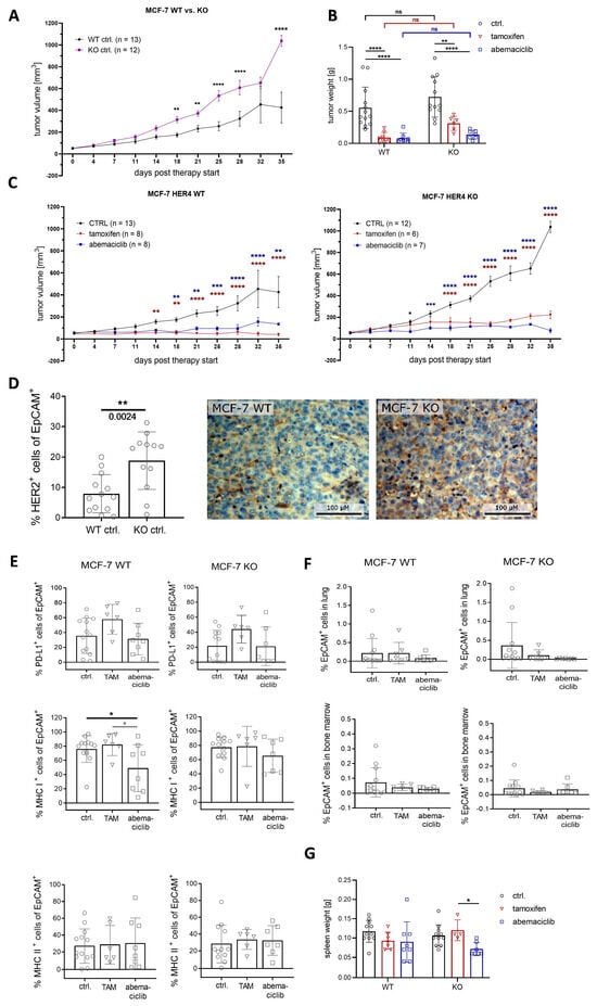 Tumor growth and tumor cell characterization in MCF-7-based HER4 WT and KO HTM. (A) Tumor growth of untreated HTM transplanted with MCF-7 WT or KO cells is shown. Data are presented as mean ± SD and two-way ANOVA and Sidak’s multiple comparisons tests were applied. (B) Tumor weight at the end of therapy is shown. Two-way ANOVA, Sidak’s, and Dunnett’s multiple comparisons tests were performed. (C) Tumor growth of HTM transplanted with MCF-7 WT or KO cells, either untreated (ctrl.) or treated with tamoxifen or abemaciclib, is displayed. Data were analyzed by two-way ANOVA and Dunnett’s multiple comparisons test. (D) Single tumor cells were analyzed by flow cytometry and the percentage of HER2 positive cells (of EpCAM pos. cells) is shown. Statistics were performed by unpaired t test, p = 0.0024. Immunohistochemical staining for HER2 was performed and is exemplarily shown for a MCF-7 WT and KO tumor, respectively. (E) PD-L1, MHC-I, and MHC-II expression on EPCAM+ cells is presented and data were analyzed by one-way ANOVA and Tukey’s multiple comparisons test. (F) Tumor cell dissemination in the lung and bone marrow (BM) was assessed by flow cytometry staining of EpCAM positive cells. (G) Spleen weight at the end of therapy is shown and differences were analyzed by two-way ANOVA, Sidak’s, and Dunnett’s multiple comparisons tests. (B,D–G) Data are shown as mean ± SD and number of animals are indicated by individual symbols. Statistical significances: * p ≤ 0.05, ** p ≤ 0.01 and *** p ≤ 0.001, **** p ≤ 0.0001.